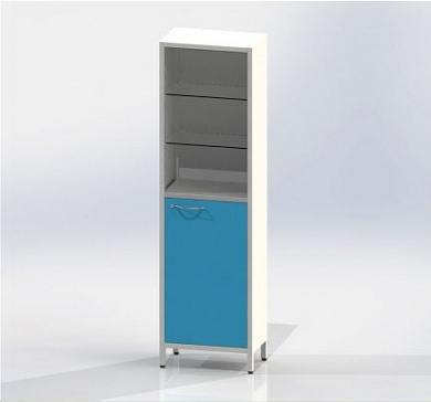 Шкаф одностворчатый на ножках, верхняя  секция с дверцей и двумя полками из стекла, нижняя секция с металлической дверцей с замком и металлической полкой.